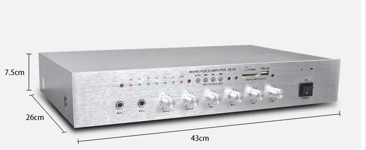 Мощности в 100 Вт достаточно для озвучивания помещения площадью до 30-40 м². При этом усилитель обеспечивает высокое качество звучания при умеренном энергопотреблении.