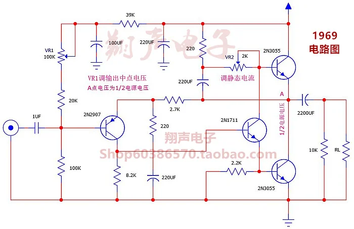 Этот усилитель был разработан как транзисторная альтернатива известному усилителю Williamson из 1947. Эта схема была усилителем класса А с триодами и десятилетиями была стандартным усилителем, сделанным своими руками.