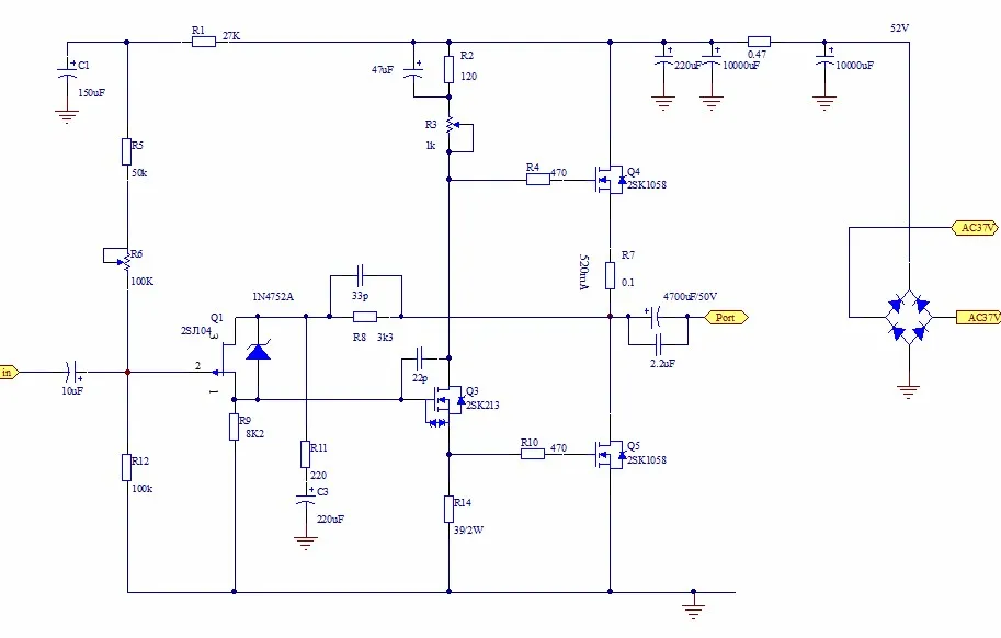 С помощью подстроечного потенциометра R1 вы можете отрегулировать напряжение между двумя силовыми транзисторами до половины напряжения питания. R8 управляет значением тока покоя через выходной каскад. Конденсатор С4 т.н. ‘ бутстрап ‘ конденсатор, который гарантирует, что транзистор T3 все еще получает достаточный управляющий ток на базе при положительных пиках выходного сигнала.