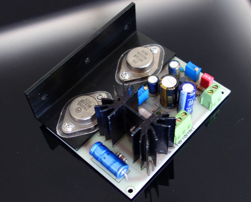 Диодный мост, микросхему стабилизатора и выходные транзисторы одного канала разместил на общем радиаторе: